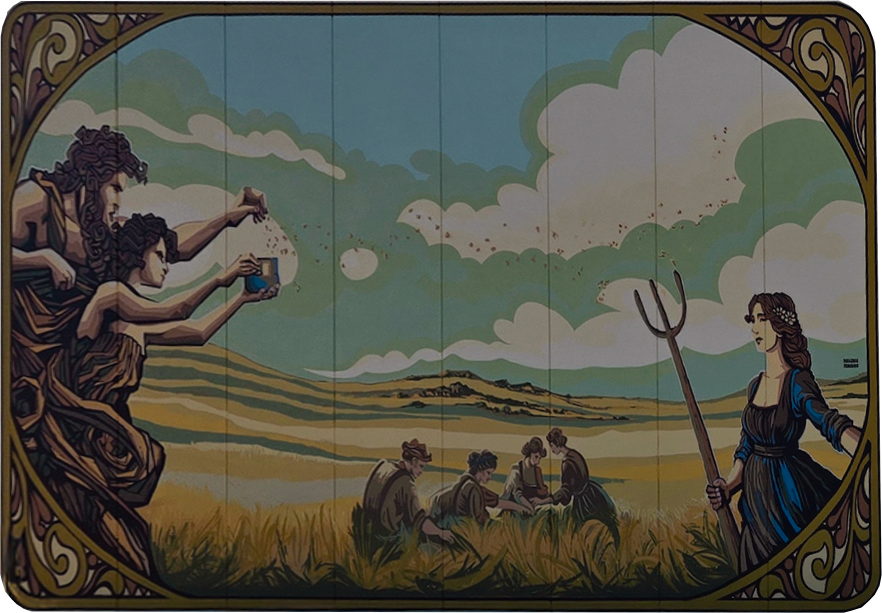 A la dreta, una dona vestida amb robes tradicionals i una diadema de fulles sosté un gran trident agrícola. La seva postura ferma i la seva expressió serena la presenten com una figura protectora del camp, com una representació de la deessa Ceres a la mitologia romana o un símbol de la tasca agrícola.